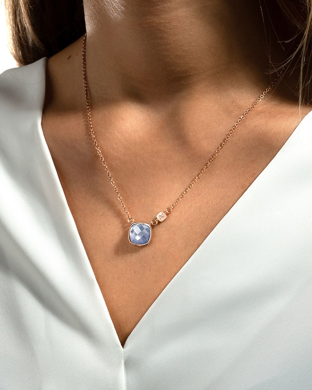 Le pendentif Malcesinia est en acier rosé, orné d'une magnifique calcédoine facettée.