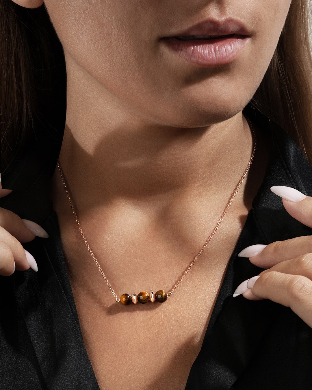 Le collier Messina est composé de 3 pierres en œil de tigre, minutieusement disposées entre des séparateurs en acier rosé.