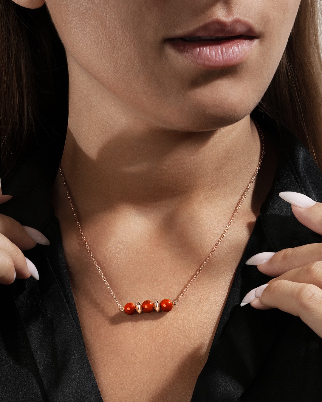Le collier Perrugina est composé de 3 superbes pierres en cornaline rouge, minutieusement disposées entre des séparateurs en acier rosé.