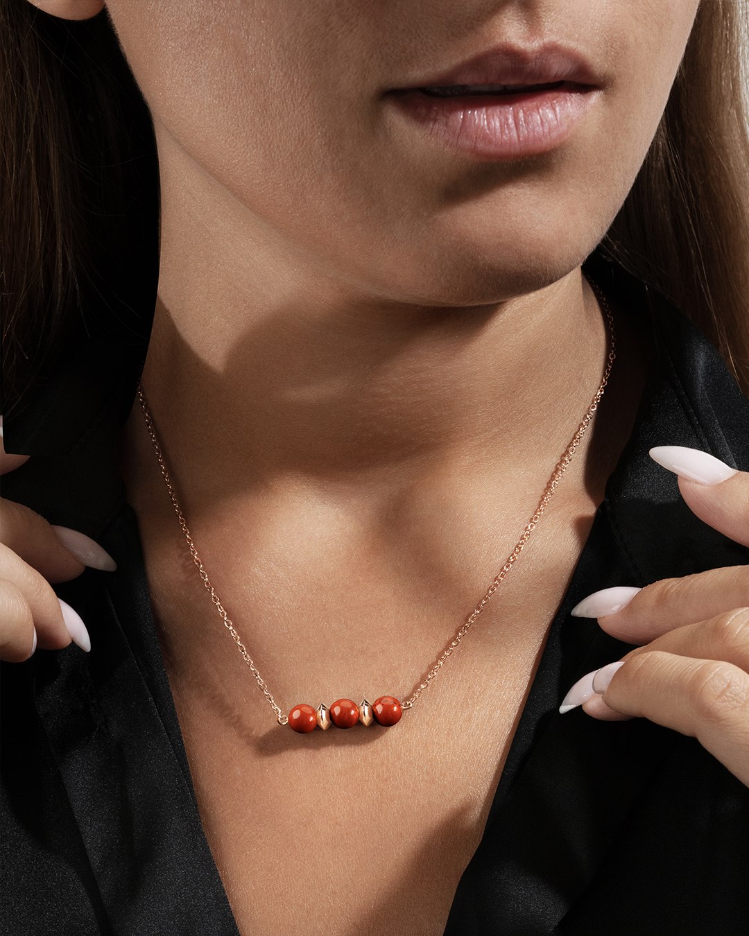 Le collier Spoletina est composé de 3 pierres en jaspe rouge, minutieusement disposées entre des séparateurs en acier rosé.
